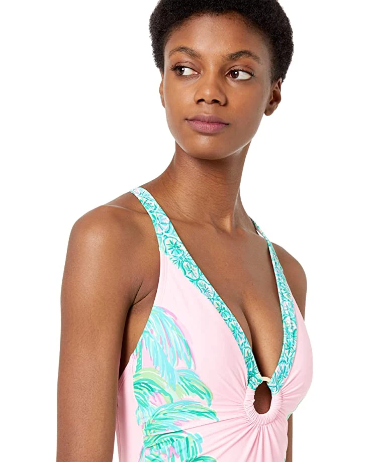 - Soak in some sun in the stunning Lilly Pulitzerยฎ Stephie One-Piece. This one-piece swimsuit features a gorgeous print, and a plunging neckline that’s cinched at the front by a hoop of gold hardware.