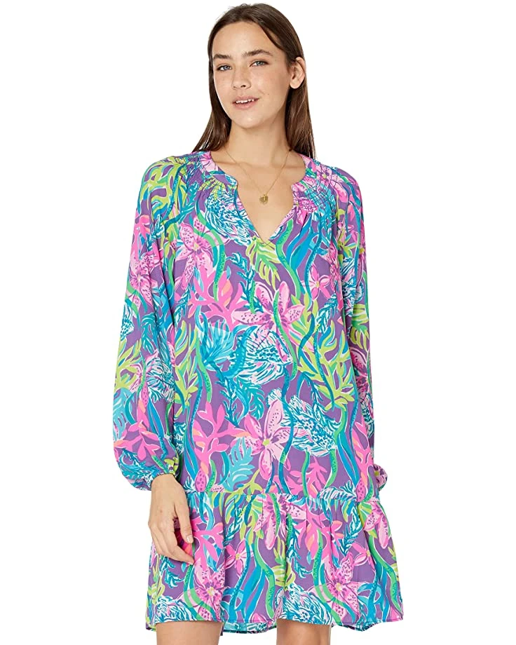 - The Lilly Pulitzer® Lucee Dress features long sleeves, smocking details at the notch neckline, and a tall ruffle at the hem.