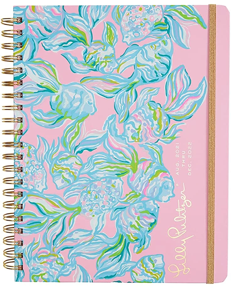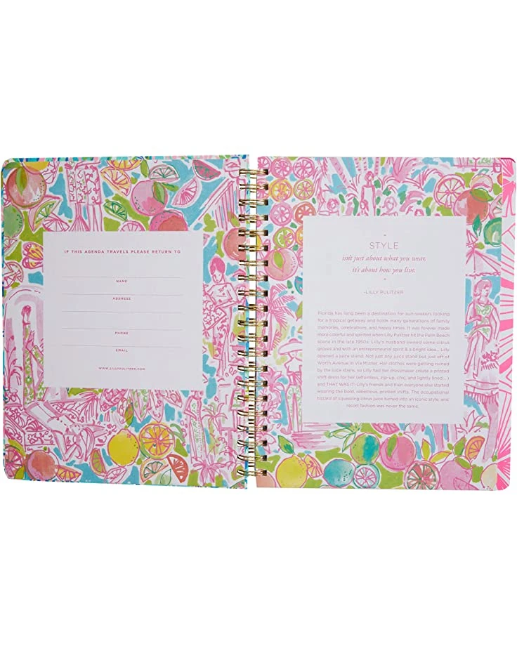 - The Lilly Pulitzer® 17 Month Jumbo Agenda hard cover planner is made with a gold-tone elastic band and spirals, reinforced printed front pocket and tabs, and two pages of new stickers inspired by custom Lilly artwork.