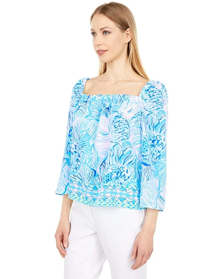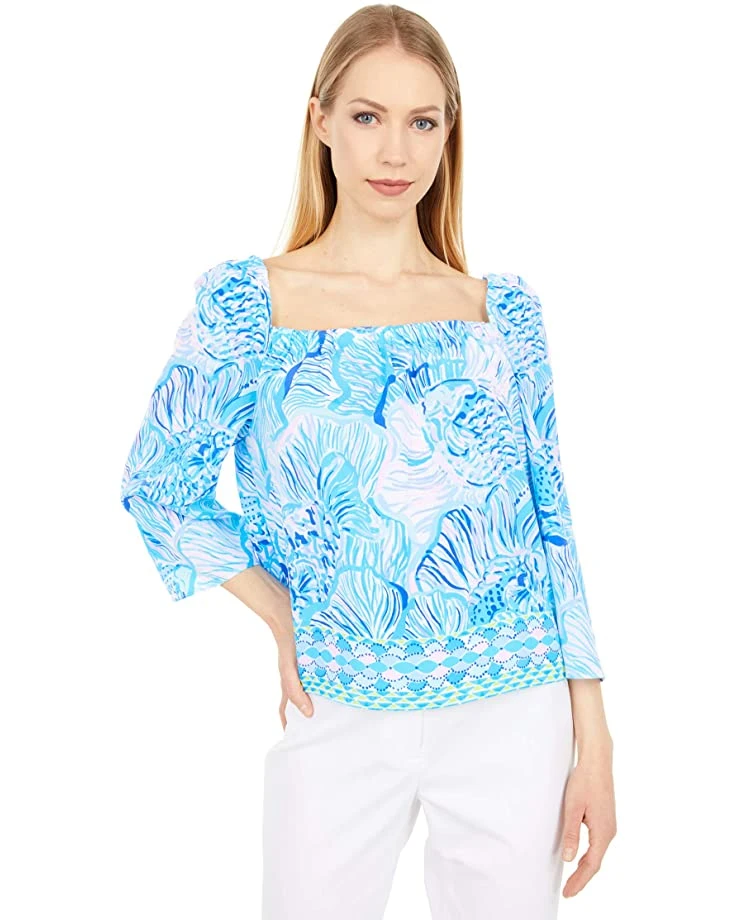 - Ready for a summer day out, the Lilly Pulitzer® Lizzie Top feature a 3/4 sleeves with a square neckline as well as an all over beautiful aquatic pattern.