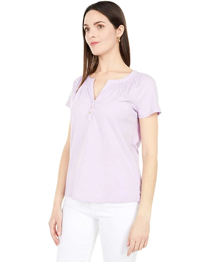 - Lilly Pulitzer® Short Sleeve Essie Top is full of character, with beautiful pleating and a unique neckline complete with buttons.