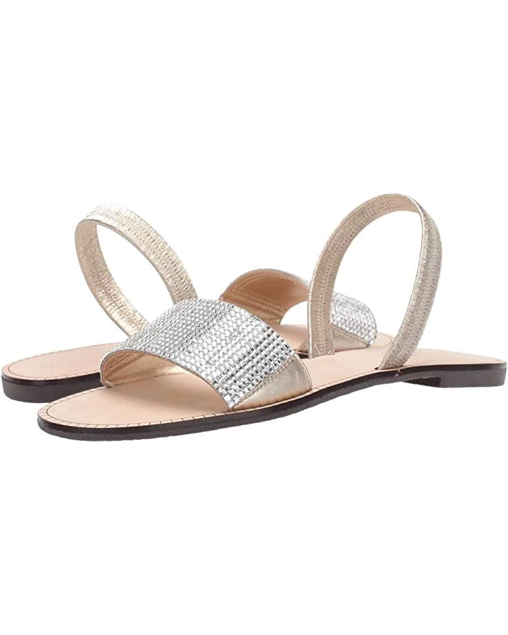 - The slip-on slide sandal is constructed from a metallic leather upper with crystal embellishing to add a bit of shine to your look.